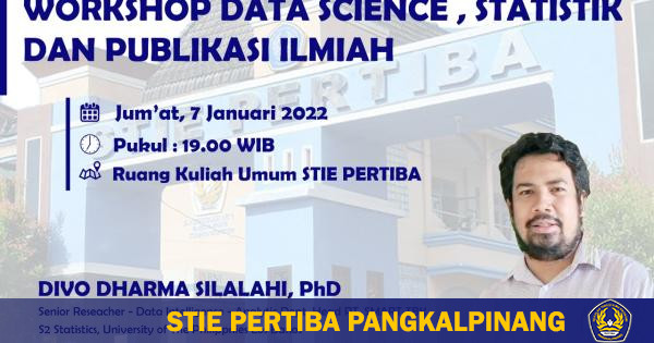 STIEPERTIBA .AC.ID, Sekolah Tinggi Ilmu Ekonomi Pertiba melalui Pusat Pengembangan Riset, Inovasi dan Kewirausahaan (PRIOK PERTIBA) menyelengarakan Workshop Bertemakan "Data Science, Statistik dan Publikasi Ilmiah". Kegiatan berlangsung di Ruang Kuliah Umum STIE PERTIBA, Jum'at, 7 Januari 2022 - 19:00 WIB s.d selesai.
